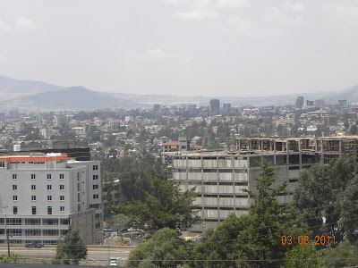 The restaurant that Mulu took us to was called Top View. I've since looked it up on the list of restaurants in Addis and it was listed under "splurge". It was very reasonable, though, in price and the food was amazing. Liam had a traditional Ethiopian meal and I had, wait for it, PASTA! Below you'll find why the restaurant got it's name. It's up on a mountain and has the most breathtaking view of the city.